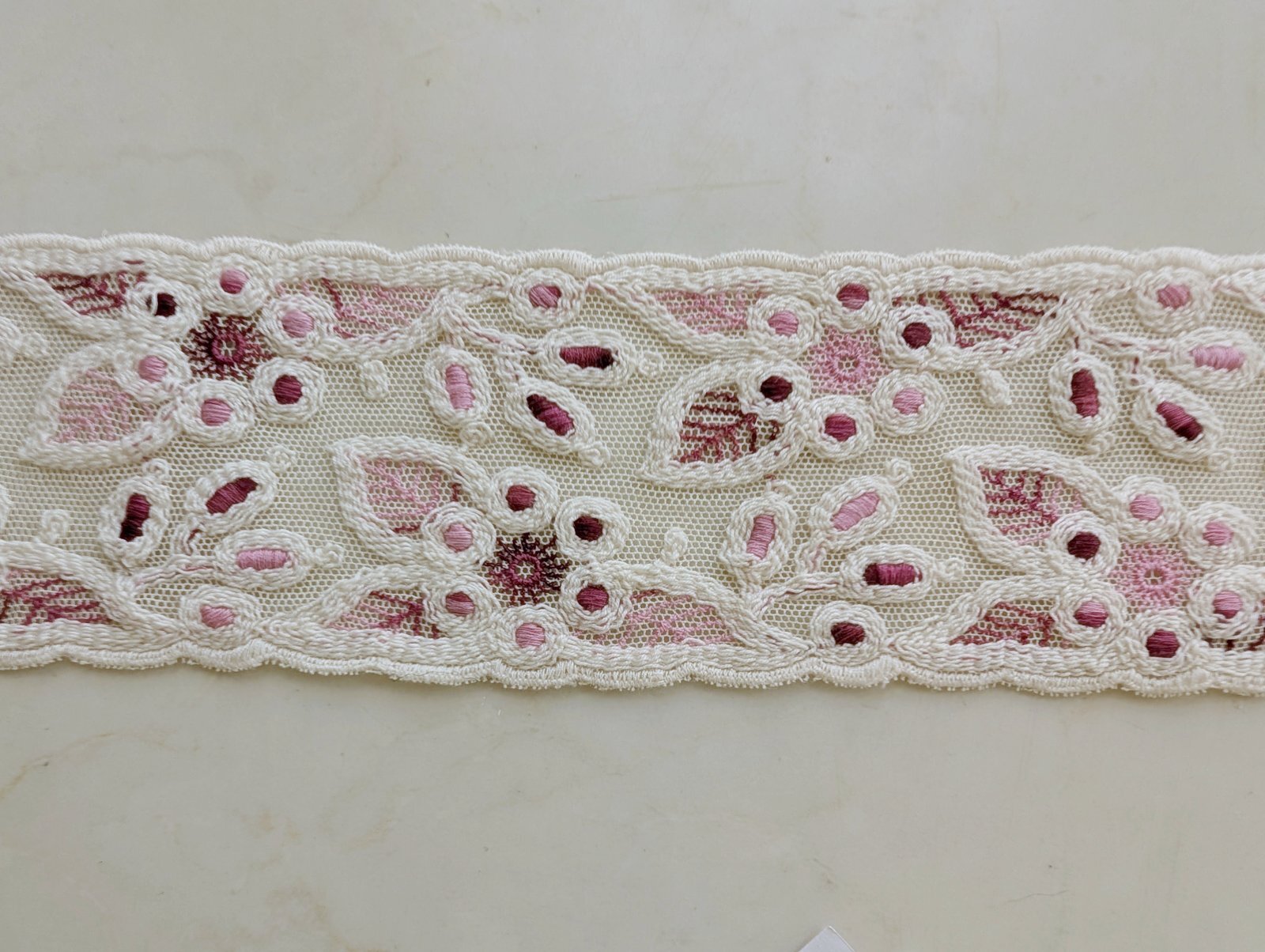 やわらかな生成り色のチュールに、濃いローズピンク系の刺繍が施されています。