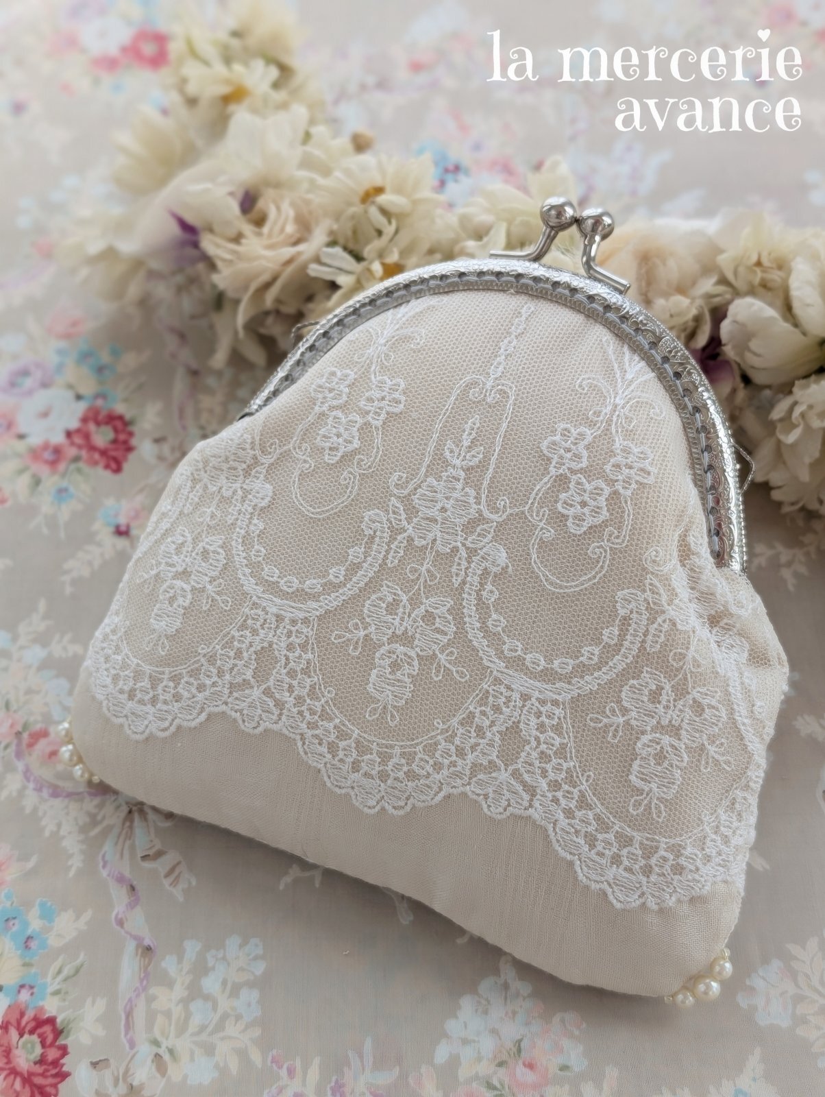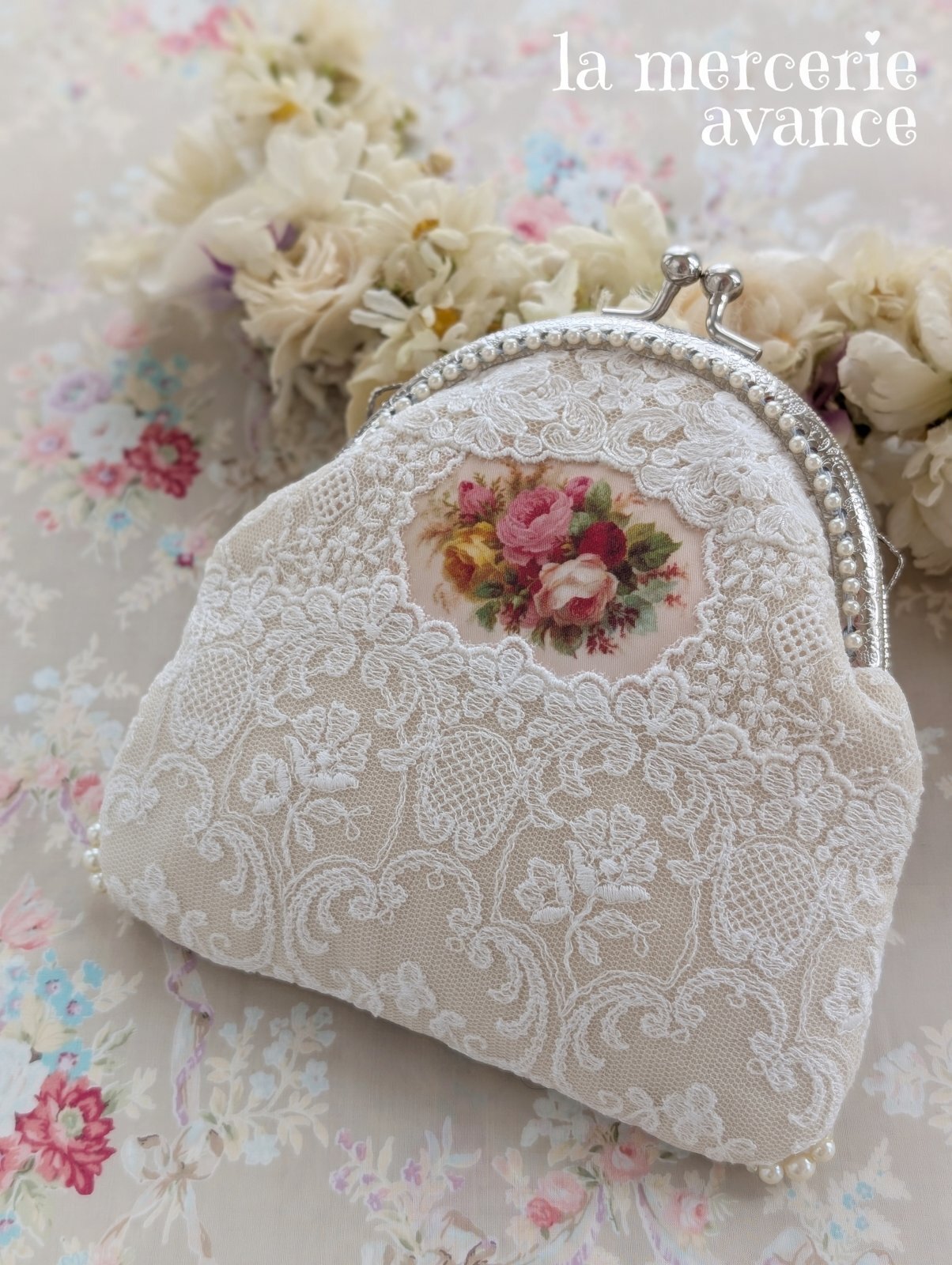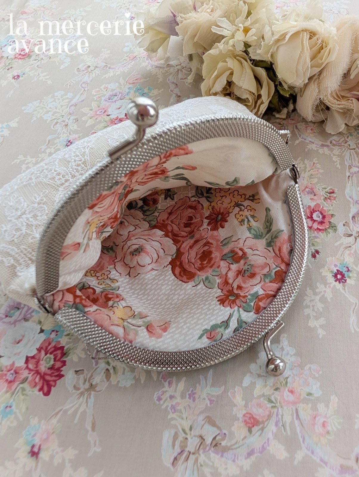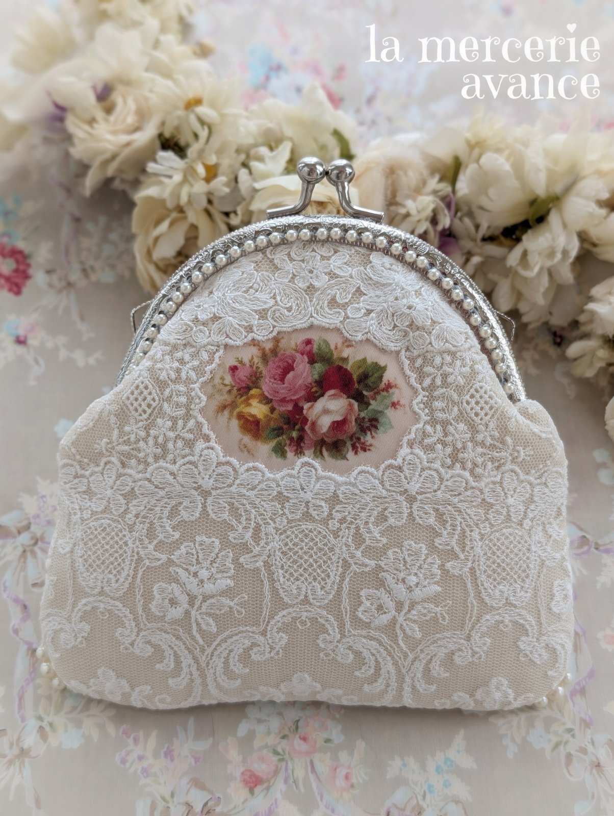 繊細なバラ柄レースを主役にした、クラシカルで上品な口金ポーチが作れる手作りキットです。