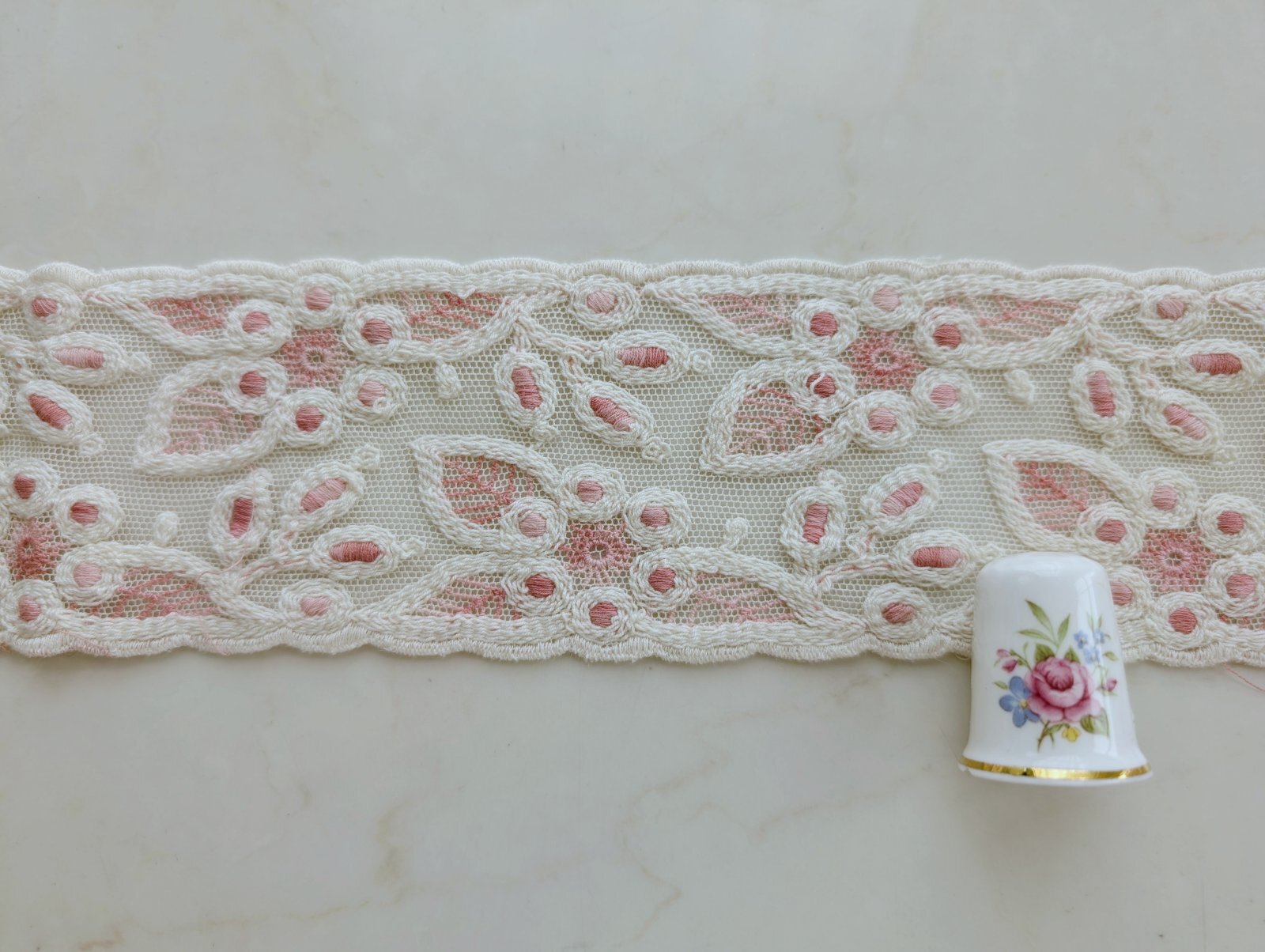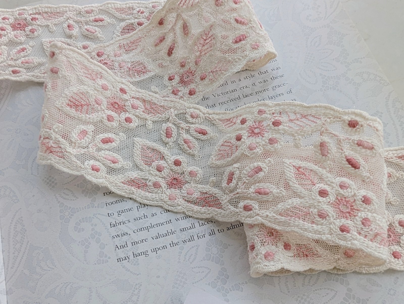 フランス製 刺繍チュールレース(生成り×濃いローズピンク)30cm 単位 [LS-028]